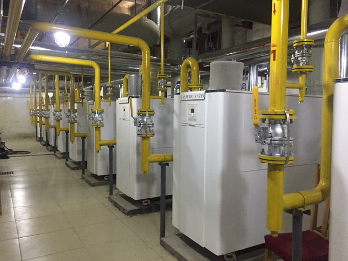 鍋爐房總設計負荷為6300KW,鍋爐房設置9臺700KW全預混高效冷凝燃氣熱水鍋爐,其中低區4臺,高區5臺,提供冬季建筑物采暖熱源。